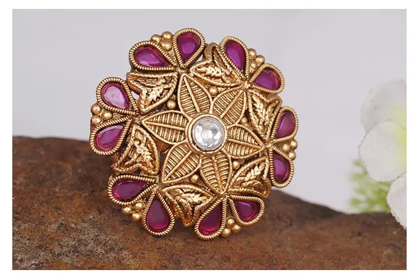 Ruby Red Matte Gold Plated Floral Ruby Adjustable Ring