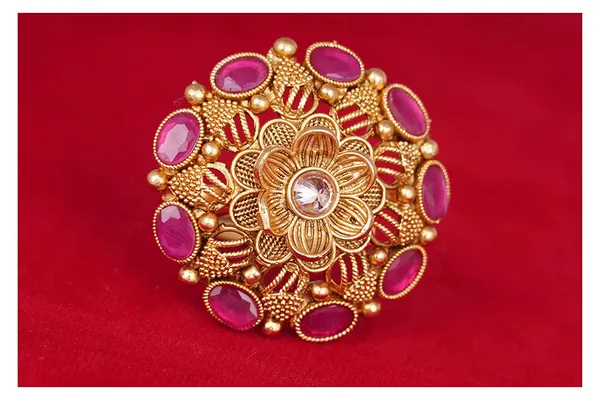 Ruby Red Matte Gold Plated Ruby Color St1 Studded Filigree Adjustable Finge..More