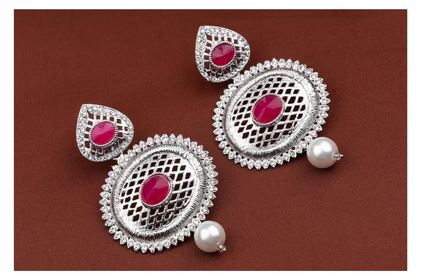 Silver Plated Oval Shape Cz Diamond Polki And Stone Studded Drop Pearl Dang..More