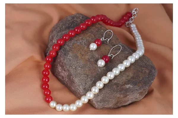 Stylish Oxidized Silver White Pearl & Red Beads Necklace Set For Women & Gi..More