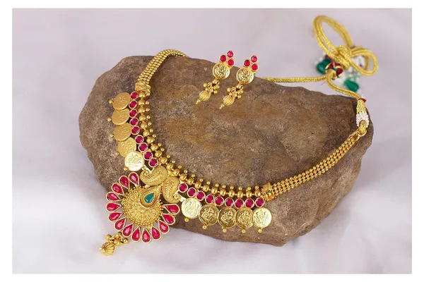 Traditional Ethnic Gold Plated Goddess Laxmi Coin And Ruby Red Stone Studde..More