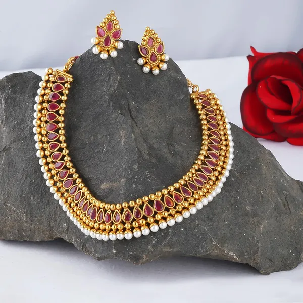 Traditional Ethnic Gold Plated Necklace Set studded with Ruby Red Stones an..More