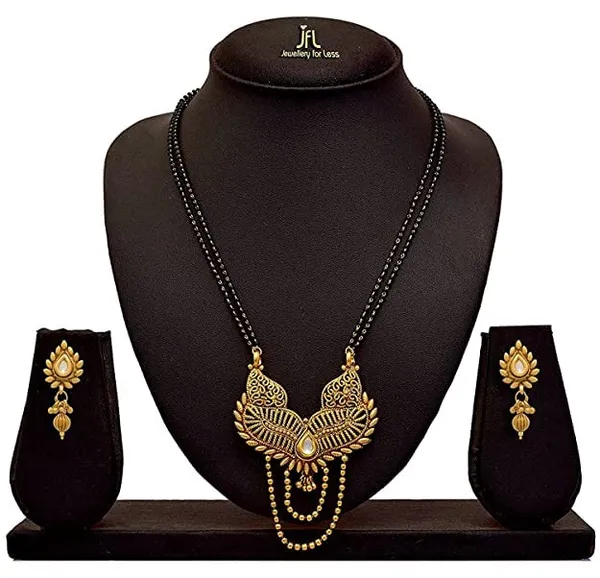 JFL - Traditional Ethnic One Gram Gold Plated Kundan Designer Mangalsutra with Black Beaded Double Chain and Earrings for Women.
