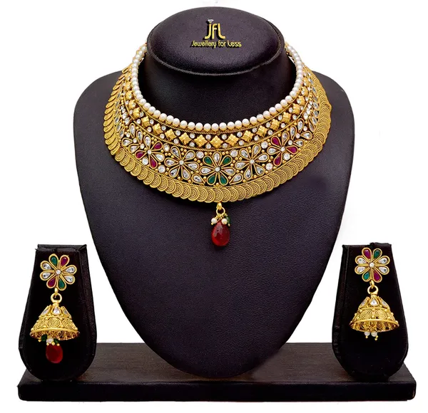 JFL - Traditional Ethnic One Gram Gold Plated Polki Diamonds Pearls Red Green Designer Semi Bridal Necklace Set / Jewellery Set for Women & Girls