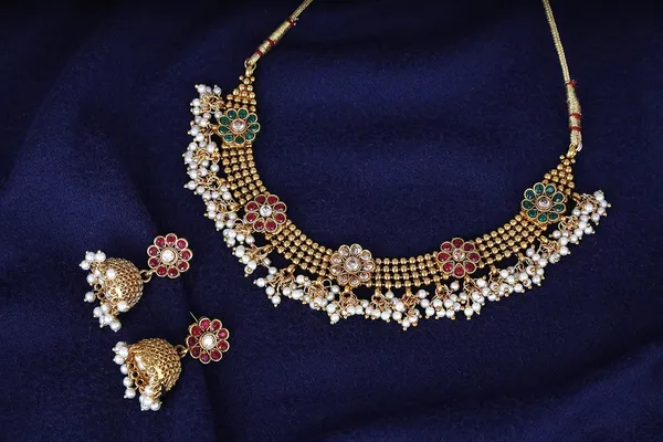 Traditional Royal Real Gold Look Studded Pink, Green & Stone Choker Necklac..More
