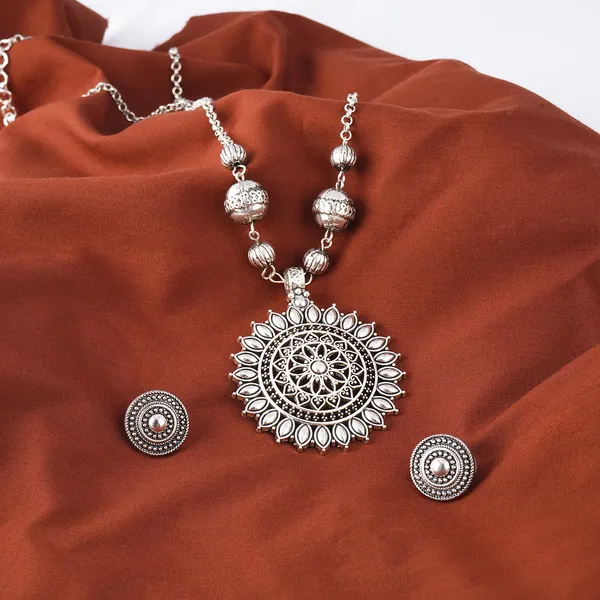 Unique Silver Plated German Oxidized Floral Pendant With Long Chain Handcra..More