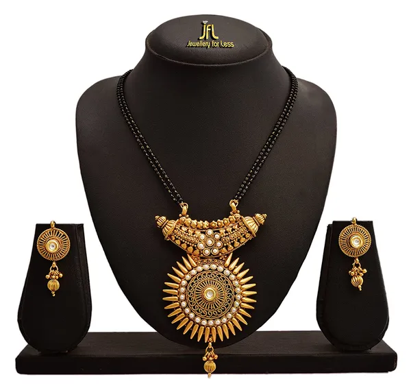 JFL - Traditional Ethnic One Gram Gold Plated Designer Mangalsutra with Earring BASE MATERIAL Copper alloy QUALITY All our Jewellery is Export quality Anti-allergic High Gold Polish Copper alloy Rust and corrosion resistant No lead or Nickel so it wont irritate your skin No Shisha hence light weight The highest quality of gold plating further ensures a long-lasting shine CARE No direct Perfume/Deo/Chemicals on the Jewellery It is advisable to store jewellery in an air-tight container as sent by Us (or in zip lock pouch) First wear your makeup, perfume - then wear your jewellery Clean it with dry and soft cloth after wearing This will keep your jewellery shining for years