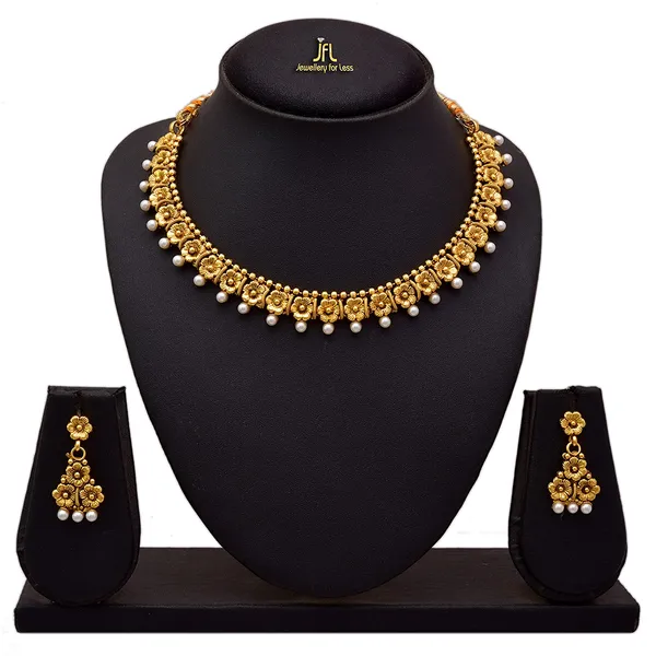 White Pearl 1 Gm Gold Plated Floral Flower Pearl Necklace Set With Earrings