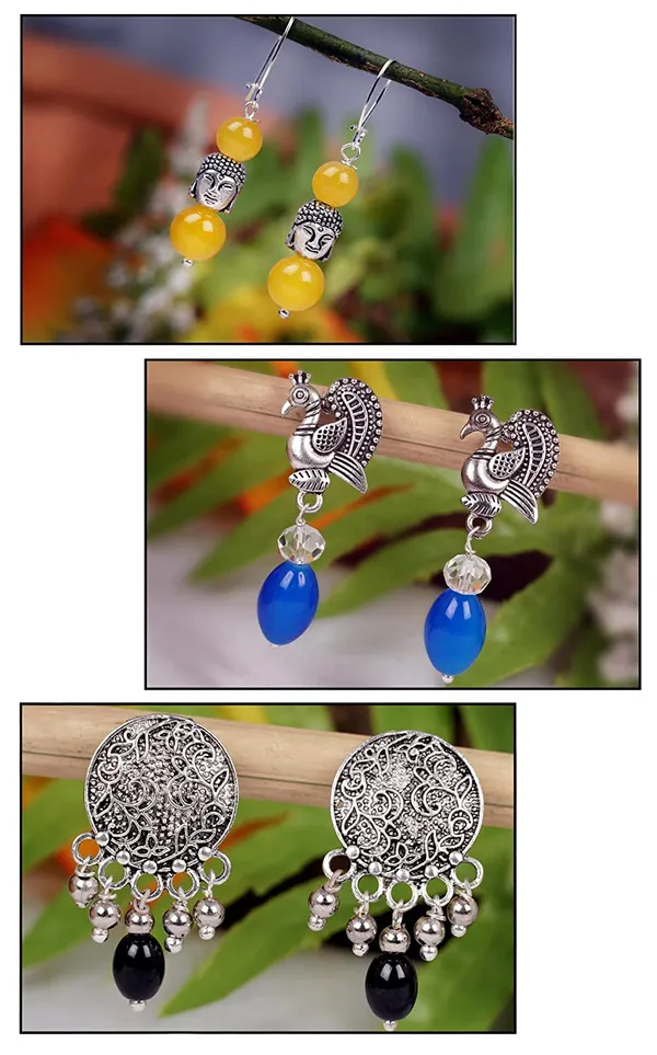 Yellow, Blue, Black Oxidised Silver Plated Handmade Beaded Dangler Earring