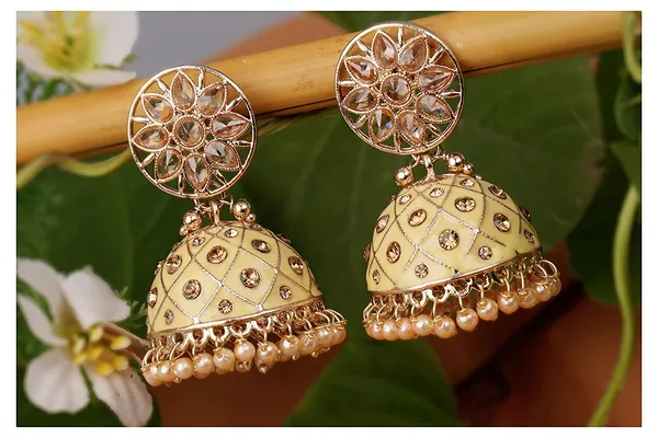 Yellow Enamel Cz Polki St1 Pearl Hanging Jhumki Earrings Jewellery