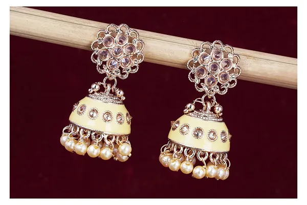 Yellow Jewellery Pearl Enamel Meenakari Hand Painted Jhumka Earrings